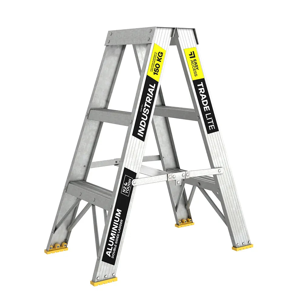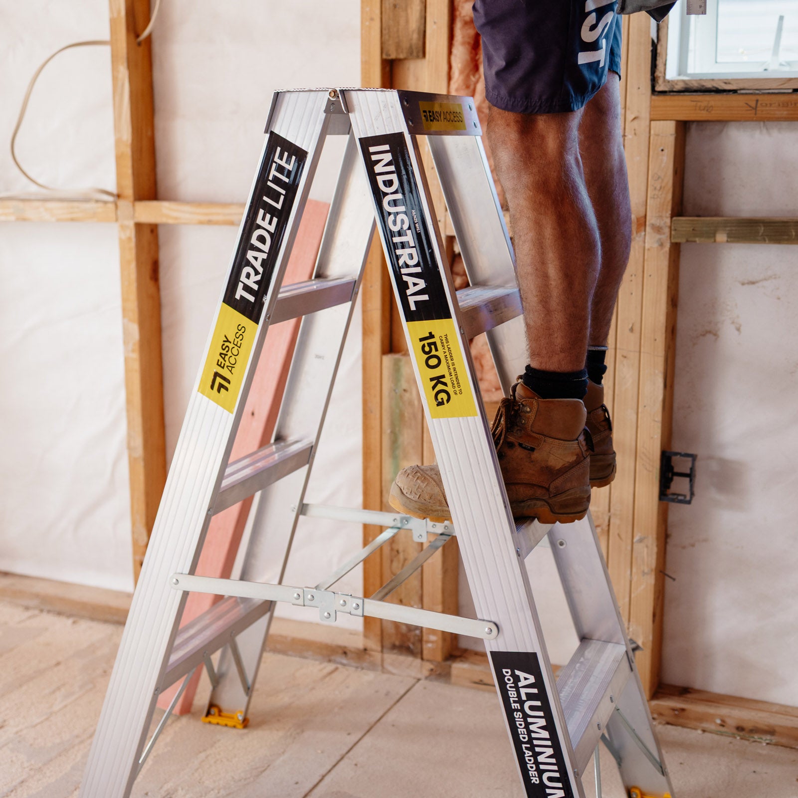 The TradeLite Double-Sided Ladder is lightweight yet durable, featuring XL Titan rivets, double-braced steps, and foldable stays for strength and longevity. Anti-slip steps, a solid hinge, and a 150kg rating ensure safety and efficiency for short-term projects. AS/NZS 1892.1:2018 compliant with a 3-year warranty.