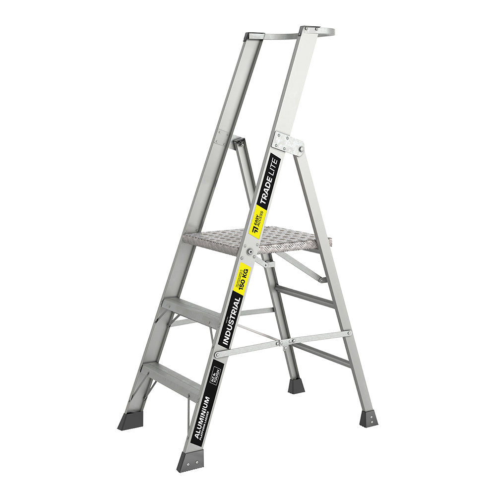 TradeLite Platform Ladders combines lightweight portability with a robust design, ensuring easy handling and safe operation. Featuring XL Titan tough rivets, double-braced steps, and large sturdy back legs, it delivers maximum durability and stability. With anti-slip steps and feet, an extra-height guard rail for user safety, and a 150kg rating, it’s both sturdy and user-friendly. Compact for storage, it complies with AS/NZS 1892.1:2018 and includes a 3-year warranty.