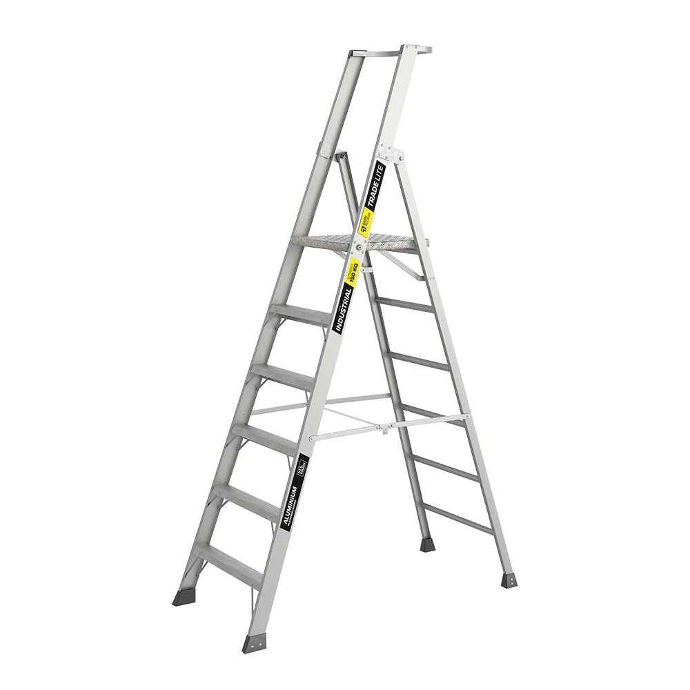 The TradeLite Platform Ladder has a lightweight robust design for safe & easy use. With a lightweight yet tough design, it includes XL Titan rivets, a non-slip checker plate platform, anti-slip steps and feet, and an extra-tall handrail for added safety. Built for durability with braced steps and back leg. 150kg load rating. AS/NZS 1892.1:2018 compliant.