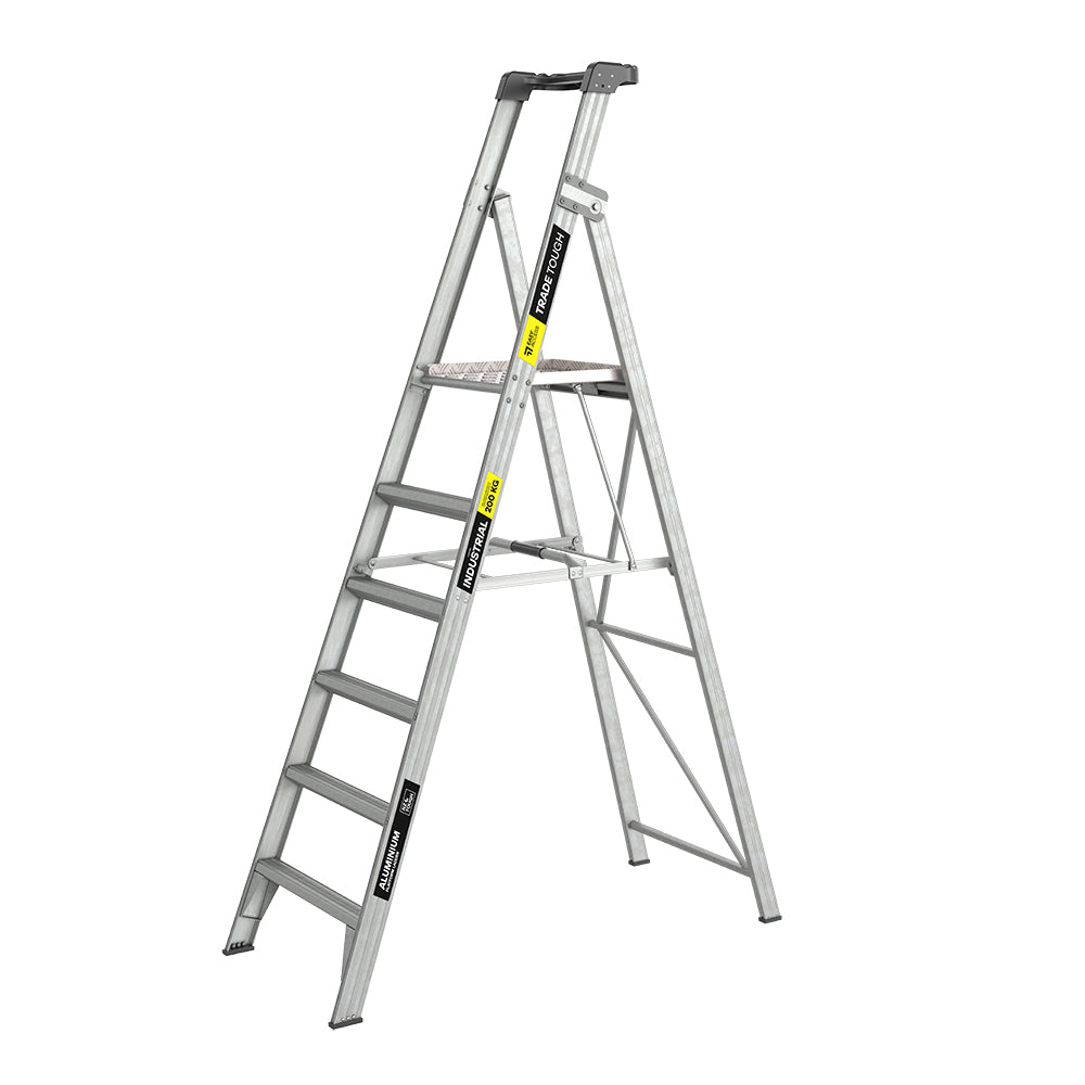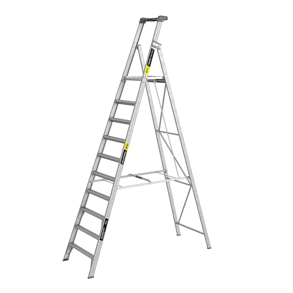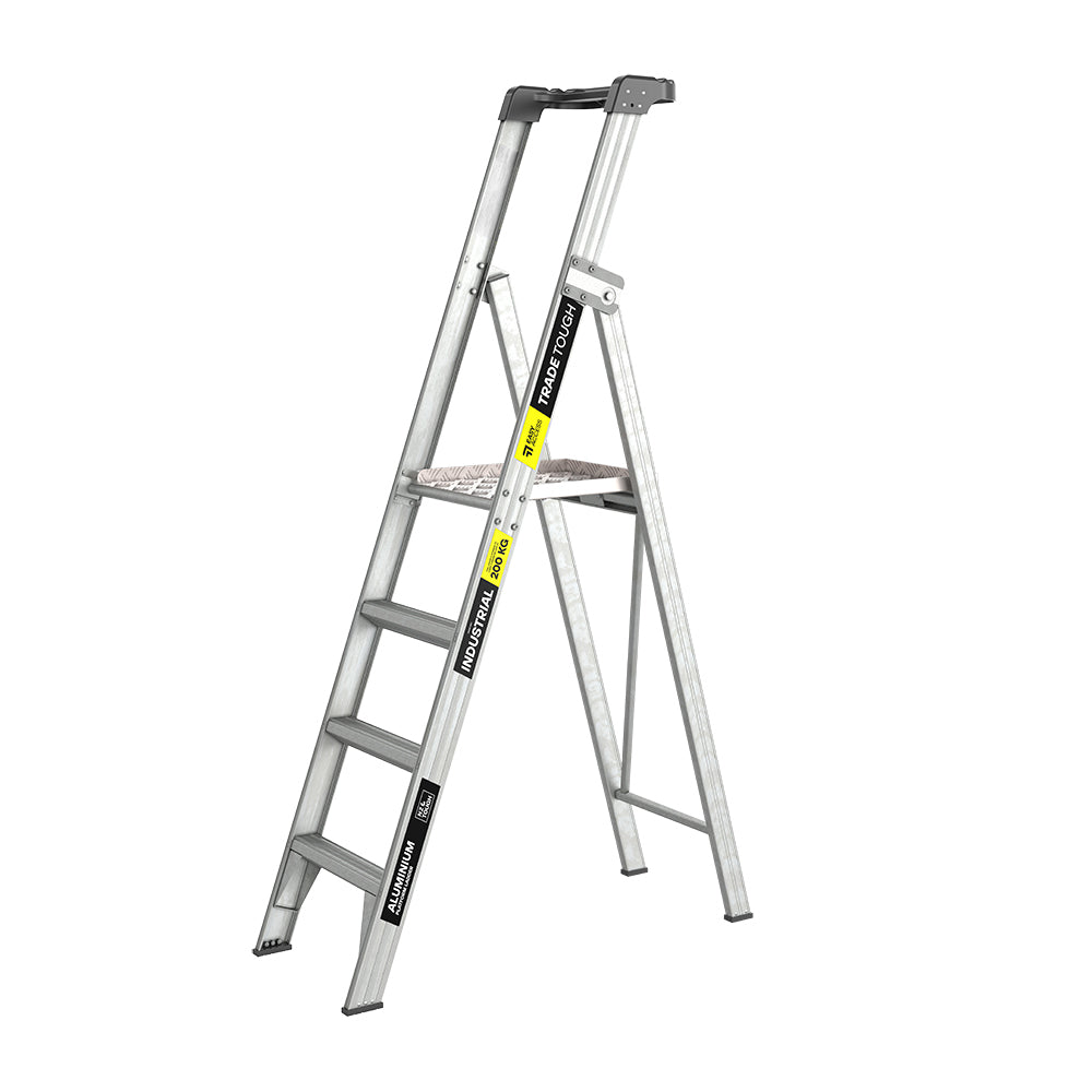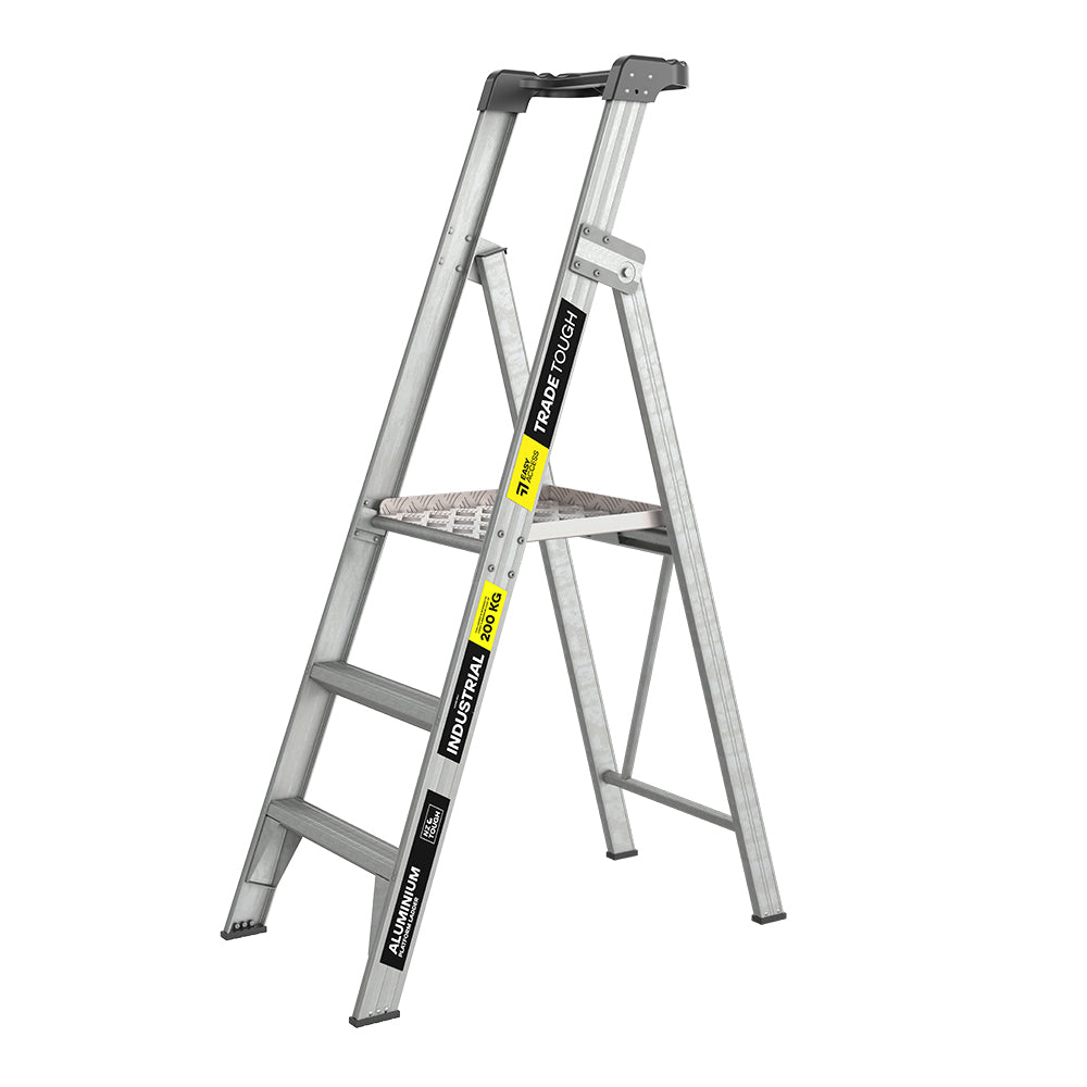 The TradeTough Platform Ladder has a 180kg load rating and is built tough with welded back legs, trapezoidal steps, double bracing, XL Titan rivets, and anti-slip feet. A tall 0.9m handrail boosts safety. Sturdy, compact, and AS/NZS 1892.1:2018 compliant, it comes with a 10-year warranty.