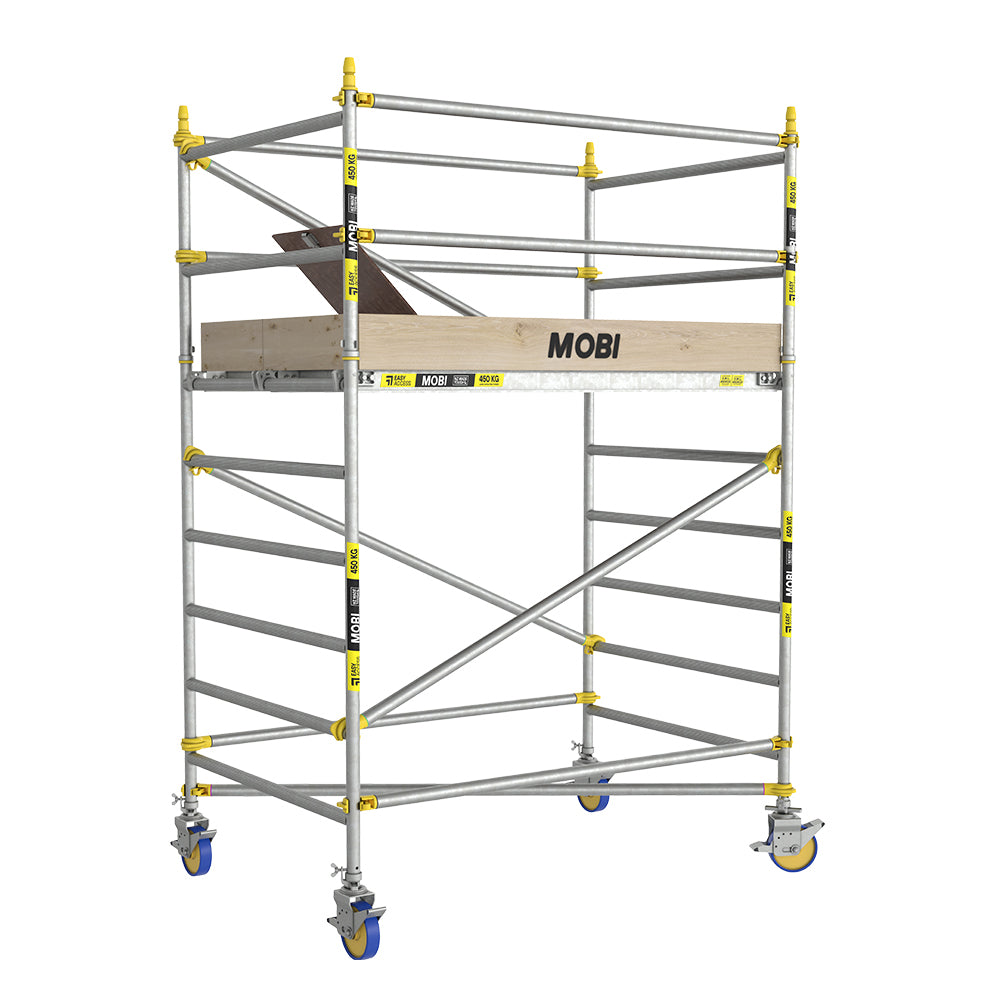 The Mobi Scaffold Range is NZ’s user-friendly large mobile scaffold range, built for strength, speed, and simplicity. Made in NZ, it’s compact yet powerful, with a 450kg load rating. Designed for tradies who demand reliability & ease of use.Mobi features a fully welded aluminium frame with an integrated ladder eliminating the need for a bulking ladder. Colour-coded components make assembly fast and intuitive, boosting productivity.With large 200mm diameter height adjustable castors, Mobi moves effortlessly and can be adjusted in height by 350mm to ensure stability on uneven surfaces. The 1400mm double-width design offers extra workspace and enhanced stability, perfect for larger jobs and multiple personnel. Single-width options are also available.All Mobi Scaffold Packs come with everything they need to be compliant such as outriggers and toeboards unlike other NZ suppliers which come as additional extras. Fully compliant and built to save you money, the Mobi ends scaffold hire costs—own it, use it, or rent it out! For one of NZ’s toughest, most versatile mobile scaffolds, think Mobi.
